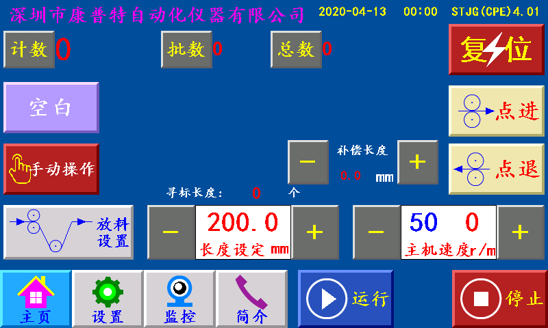 三、主页 长度设定:显示制袋所设定长度,单位:毫米(也可以当按键直接调节长度) 放料设置:点击此键进入后放料设置界面。 主机速度:控制主机加减速快慢。 补偿长度:点击加减键设置补偿伺服(步进)电机多走少走。 计数/清零:单批次累计到一批个数结束时,个数自动归零;按“计数/清零”键清零清个数。 批数/清零:一批结束后,批数加“1”, 总数/清零:个数每加一个,总数加“1”;按“总数/清零”键清零总数。 空白/深色/浅色:三种状态切换。 空白:指光电忽略色标光电传感器信号; 深色:指跟踪印刷制品时,以深颜色的色标点为跟踪点; 浅色:指跟踪印刷制品时,以浅颜色的色标点为跟踪点。 点进:在停止状态下,手动伺服(步进)电机正转。 点退:在停止状态下,手动伺服(步进)电机反转,在运行状态下此键变为“补数”,按此键计数减1。 复位:系统不能正常工作时,按此键程序重新启动,也可以做紧急停机用。 运行:按此键,主机正常运行。(长按3秒左右) 停止:按此键,霍尔开关GK1检测到高位停机信号;主机自动停机。 状态显示:运行/停止/切刀降速/暂停/脱标/完料/堵料,七种状态切换显示。 运行:按启动键后显示“运行”。 停止:通电后一直显示“停止”。 切刀降速:主机速度过快步进(伺服)电机送料还没有结束时,主机停机显示“切刀降速”。 暂停:当机型选择“暂停”时一批结束停机N秒后主机自动开机。 脱标:在制作印刷制品时没有跟踪到色标点显示“脱标”。 完料:当主机运行,X15检测到完料信号时,蜂鸣器报警,主机停机,显示故障“完料”。主机停止状态下X15检测到完料信号时,蜂鸣器报警,显示故障“完料”。(按“停止”清除故障) 堵料:当主机运行,X16检测到堵料信号,超过堵料时间后,主机停止,显示故障“堵料”。
