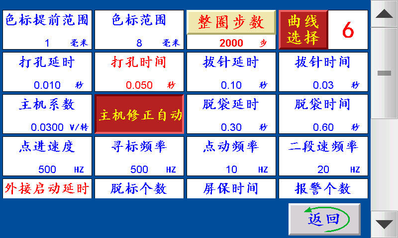 五、副菜单 色标范围:制作彩色制品时,伺服(步进)电机以恒定的速度寻找色标点的范围(即色标光电在『长度—设定的色标范围长度』范围内寻找色标,寻至『长度+设定的色标范围长度』。 色标提前范围:制作彩色制品时,伺服(步进)电机在料送结束之前,提前以恒定的速度寻找色标。 打孔延时:送料结束后延时此参数设定的时间后打孔信号输出。 打孔时间:伺服(步进)电机转结束,打孔电磁阀工作的时间。 拔针延时:一批结束后延时此参数设定的时间后拔针信号输出。 拔针时间:一批结束后延时“拔针延时”的时间后拔针信号输出,跟脱袋信号一起断开。 竖吹时间:由输入点竖吹输入控制竖吹信号输出,时间由此参数来设定调节。 脱袋时间:一批结束后延时“拔针延时”加“拔针时间”的时间后脱袋信号输出,时间结束后跟拔针信号一起断开 报警个数:一批结束前提前N个报警。 点进速度:伺服(步进)电机的点进/点退时的速度,设定越大,伺服(步进)电机的转速越快。 寻标频率:伺服(步进)电机追色标时的速度,设定越大,伺服(步进)电机的转速越快。 点动频率:停止状态下,X04(点动)收到信号时,Y07主机信号输出,切刀上下运行,速度由此参数调节。 二段速频率:主机运行时按停止键,主机切换成二段速停机,二段速速度由此参数调节。 外接启动延时:点击外接启动按钮时,持续该时间后主机开始启动。 脱标个数:设定N个,制作彩色制品时,跟踪N次色标点,跟踪不住自动停机。 送料延时:下一次送料时,延时送料延时时间后开始送料。 屏保时间:主机运行状态下,在主界面停留此时间进入屏保状态。(设置0则屏保无效) 空切退料长度:空切时先回退的长度。 横吹百分比:由输入点X01送料信号控制横吹信号输出,输出时间由此参数来设定调节。 堵料时间:当堵料信号高于堵料时间时,蜂鸣器报警,故障停机显示“堵料” 预退长度:伺服(步进)电机送料前先反转预退的长度后,再正转预退的长度加上原定的送料长度 整圈步数:伺服(步进)电机转一圈所需要的脉冲个数。 曲线选择:1~9,步进电机默认1,伺服电机默认6 主机系数:控制主机速度快慢。 主机修正手动/主机修正自动: 主机修正手动:手动调节主机系数来改变主机速度 主机修正自动:自动修正好主机速度对应的主机系数大小。