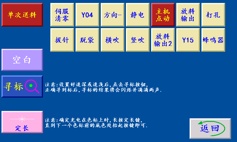 六、手动操作 单次送料:停机状态下,点击此键,送一次料后停止。 寻标:当‘寻标’键选择“深色/浅色”时按此键,伺服(步进)电机一直转到深色的色标点自动 停转时,设置为“追深”;伺服(步进)电机一直转到浅色的色标点自动停转时,设置为“追浅。 当‘寻标’键选择“空白”时,按此键无效 (注释:黄色按键在停机状态下,测试脚位是否正常)