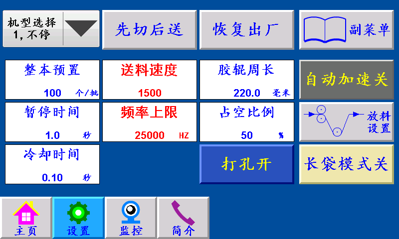 四、设置 不停/暂停/?;骸安煌!保阂慌崾骰煌?,继续正常工作。 “暂?!保阂慌崾骰萃#5皆萃J奔浣崾骰远?。 “?;保阂慌崾骰远;蟛辉僭诵?,手动按启动键方可运行。 先切后送/先送后切:“先切后送”:按启动键,主机先运行,GK1霍尔开关检测到伺服(步进)电机的送料信号,伺服(步进)电机开始送料。 “先送后切”:按启动键,伺服(步进)先送料,送料结束后主机再运行。 恢复出厂:按此键恢复出厂设置(慎用)。 副菜单:点击此键进入副菜单界面。 整本预置:一批设定的个数,提前5个报警。单位:个 暂停时间:当机型选择暂停,一批结束后主机自动停机所设定的时间。 送料速度:伺服(步进)电机的加减速时间,设定越大,伺服(步进)电机起步越快。 频率上限:伺服(步进)电机的最高转速,设定越大,伺服(步进)电机的转速越快。 胶辊周长:伺服(步进)电机带动橡胶辊转一圈的长度。 占空比例:“自动送料”时,主机运行一个周期送料所占的时间比例。 冷却时间:长袋模式开下,主机切完袋子回到高位后进行冷却的时间 打孔开/关:控制是否需要输出打孔信号。 自动加速关/自动加速开: 自动加速关:自己调节送料速度 自动加速开:根据设定的袋长等自动调节送料速度 长袋模式关/长袋模式开: 长袋模式关:主机不停 长袋模式开:主机切完袋子后高位冷却暂停