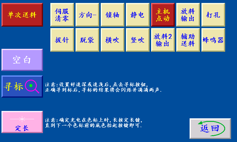 六、手动操作界面 单次送料:停机状态下,点击此键,送一次料后停止。 寻标:当‘寻标’键选择“深色/浅色”时按此键,伺服(步进)电机一直转到深色的色标点自动 停转时,设置为“追深”;伺服(步进)电机一直转到浅色的色标点自动停转时,设置为“追浅。 当‘寻标’键选择“空白”时,按此键无效 (注释:黄色按键在?;刺拢馐越盼皇欠裾?span style="font-family:"">)