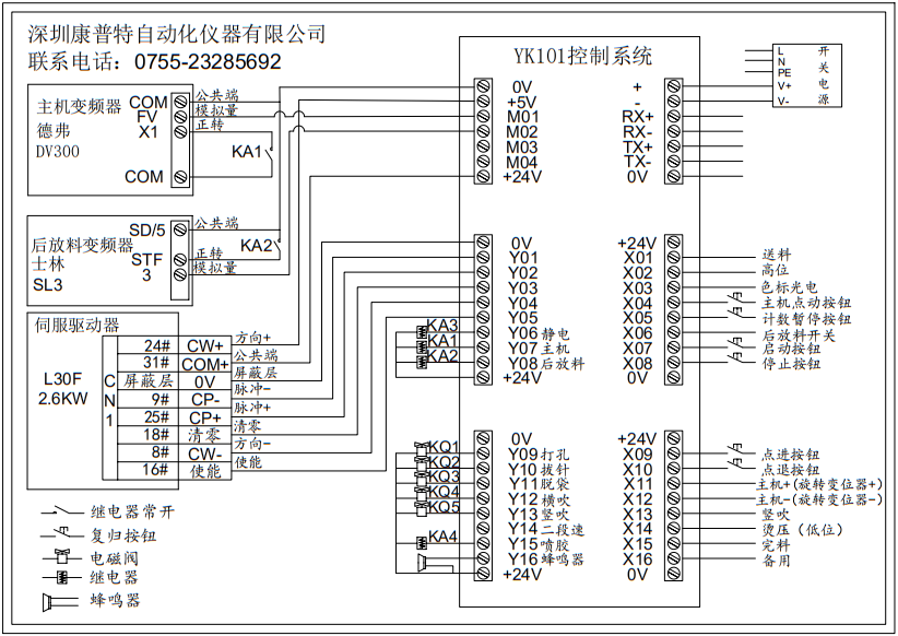 01,+24V 01,0V 02,X01 GK1送料 02,Y01 (CP1脉冲-) 03,X02 GK2高位 03,Y02 (CP1脉冲+) 04,X03 色标光电 04,Y03 伺服清零 05,X04 外接主机点动 05,Y04 (CW-方向) 06,X05 计数开关 06,Y05 锁轴 07,X06 放料开关 07,Y06 静电输出信号(0V) 08,X07 外接启动 08,Y07 主机输出信号(0V) 09,X08 外接停止 09,Y08 放料开关信号(0V) 10,0V 10,+24V