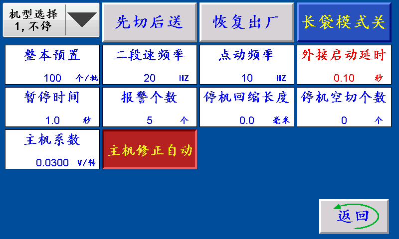 放料修正:控制后放料电机的加减速快慢,设定值越小越快。