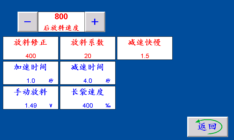 后放料速度:控制后放料电机的转速快慢。 手动放料:停机状态下,手动放料的速度。 放料修正:控制后放料电机的加减速快慢,设定值越小越快。 放料系数:控制后放料速度加减变化的当量。 加速时间:主机启动后,后放料起步加速到最高速所需的时间。 减速时间:主机停止后,后放料从最高速减到最低速所需的时间。 减速快慢:控制后放料减速变化的当量。 长袋速度:长袋模式开下,后放料的速度。