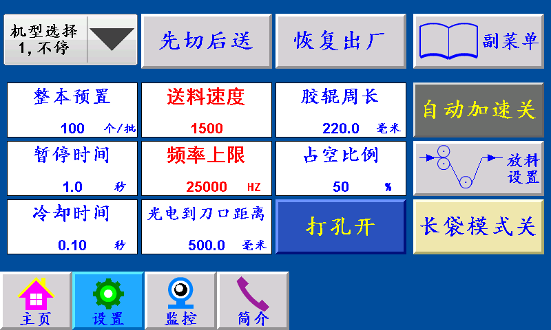 三、主页 长度设定:显示制袋所设定长度,单位:毫米(也可以当按键直接调节长度) 排废长度:显示整本排废预切材料所设定长度,单位:毫米(也可以当按键直接调节长度) 主机速度:控制主机加减速快慢。 锁轴/松轴:松开/锁住电机轴承 计数开/计数关:控制每次送料是否需要计数。 计数/清零:单批次累计到一批个数结束时,个数自动归零;按“计数/清零”键清零清个数。 批数/清零:一批结束后,批数加“1”, 总数/清零:个数每加一个,总数加“1”;按“总数/清零”键清零总数。 点进:在停止状态下,手动伺服(步进)电机正转。 点退:在停止状态下,手动伺服(步进)电机反转,在运行状态下此键变为“补数”,按此键计数减1。 复位:系统不能正常工作时,按此键程序重新启动,也可以做紧急停机用。 运行:按此键,主机正常运行。(长按3秒左右) 停止:按此键,霍尔开关GK1检测到高位停机信号;主机自动停机。 状态显示:运行/停止/切刀降速/暂停/脱标/完料,六种状态切换显示。 运行:按启动键后显示“运行”。 停止:通电后一直显示“停止”。 切刀降速:主机速度过快步进(伺服)电机送料还没有结束时,主机停机显示“切刀降速”。 暂停:当机型选择“暂停”时一批结束停机N秒后主机自动开机。 脱标:在制作印刷制品时没有跟踪到色标点显示“脱标”。 完料:当主机运行,X15检测到断料信号时,蜂鸣器报警,主机停机,显示故障“完料”。主机停止状态下X15检测到完料信号时,蜂鸣器报警,显示故障“完料”。(按“停止”清除故障) 四、设置![]() 不停/暂停/停机:“不停”:一批结束主机不停,继续正常工作。 “暂停”:一批结束主机暂停,停到暂停时间结束,主机自动开机。 “停机”:一批结束主机自动停机后不再运行,手动按启动键方可运行。 先切后送/先送后切:“先切后送”:按启动键,主机先运行,GK1霍尔开关检测到伺服(步进)电机的送料信号,伺服(步进)电机开始送料。 “先送后切”:按启动键,伺服(步进)先送料,送料结束后主机再运行。 放料设置:点击此键进入放料设置界面修正当前主机模拟系数。 恢复出厂:按此键恢复出厂设置(慎用)。 副菜单:点击此键进入副菜单界面。 整本预置:一批设定的个数,提前5个报警。单位:个 暂停时间:当机型选择暂停,一批结束后主机自动停机所设定的时间。 送料速度:伺服(步进)电机的加减速时间,设定越大,伺服(步进)电机起步越快。 频率上限:伺服(步进)电机的最高转速,设定越大,伺服(步进)电机的转速越快。 胶辊周长:伺服(步进)电机带动橡胶辊转一圈的长度。 占空比例:“自动送料”时,主机运行一个周期送料所占的时间比例。 冷却时间:长袋模式开下,主机切完袋子回到高位后进行冷却的时间 光电到刀口距离:测试好光电到刀口距离并设定。 打孔开/关:控制是否需要输出打孔信号。 自动加速关/自动加速开: 自动加速关:自己调节送料速度 自动加速开:根据设定的袋长等自动调节送料速度 长袋模式关/长袋模式开: 长袋模式关:主机不停 长袋模式开:主机切完袋子后高位冷却暂停