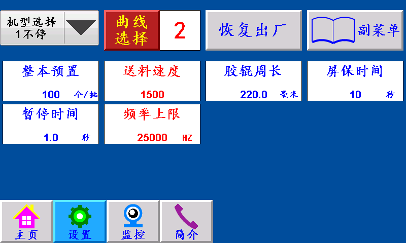 四、设置 不停/暂停/停机:“不停”:一批结束主机不停,继续正常工作。 “暂停”:一批结束主机暂停,停到暂停时间结束,主机自动开机。 “停机”:一批结束主机自动停机后不再运行,手动按启动键方可运行。 恢复出厂:按此键恢复出厂设置(慎用)。 副菜单:点击此键进入副菜单界面。 整本预置:一批设定的个数,提前5个报警。单位:个 暂停时间:当机型选择暂停,一批结束后主机自动停机所设定的时间。 送料速度:伺服(步进)电机的加减速时间,设定越大,伺服(步进)电机起步越快。 频率上限:伺服(步进)电机的最高转速,设定越大,伺服(步进)电机的转速越快。 胶辊周长:伺服(步进)电机带动橡胶辊转一圈的长度。 曲线选择:1~9,步进电机默认1,伺服电机默认6