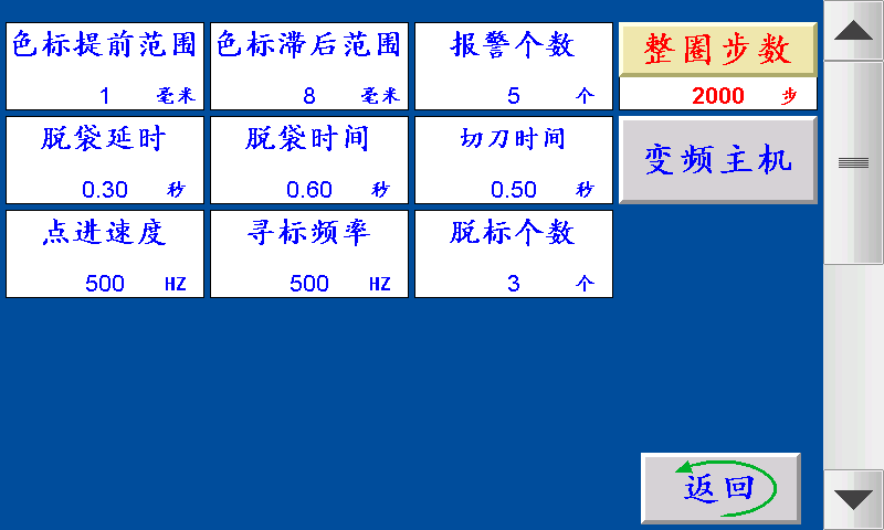 五、副菜单 色标范围:制作彩色制品时,伺服(步进)电机以恒定的速度寻找色标点的范围(即色标光电在『长度—设定的色标范围长度』范围内寻找色标,寻至『长度+设定的色标范围长度』。 色标提前范围:制作彩色制品时,伺服(步进)电机在料送结束之前,提前以恒定的速度寻找色标。 脱袋时间:一批结束后延时“脱袋延时”的时间后脱袋信号输出,时间结束后断开。 报警个数:一批结束前提前N个报警。 点进速度:伺服(步进)电机的点进/点退时的速度,设定越大,伺服(步进)电机的转速越快。 寻标频率:伺服(步进)电机追色标时的速度,设定越大,伺服(步进)电机的转速越快。 脱标个数:设定N个,制作彩色制品时,跟踪N次色标点,跟踪不住自动停机。 整圈步数:伺服(步进)电机转一圈所需要的脉冲个数。 切刀时间:料送结束后,气动切刀输出“切刀时间”后,切刀信号关闭。 变频主机/气动切刀: 变频主机:切刀使用变频控制,由高位信号控制切刀关闭。