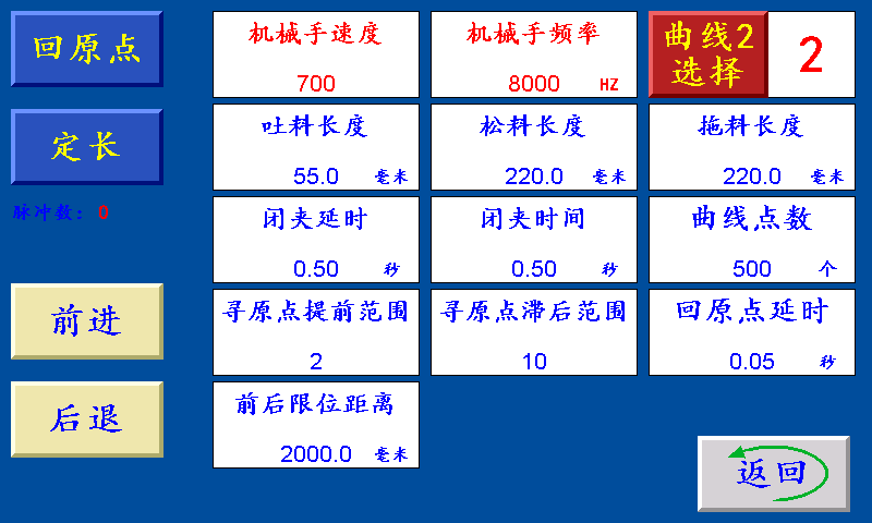 六、机械手设置界面 机械手速度:伺服(步进)电机的加减速时间,设定越大,伺服(步进)电机起步越快。 机械手频率:伺服(步进)电机的最高转速,设定越大,伺服(步进)电机的转速越快。 曲线2选择:1~9,步进电机默认1,伺服电机默认6 回原点:停机状态下,机械手回到原点左限。 定长:停机状态下,计算机械手前后限位所需要的总脉冲数。 前进:在停止状态下,手动伺服(步进)电机正转。 后退:在停止状态下,手动伺服(步进)电机反转。 吐料长度:每次送料时,送料伺服(步进)电机先送吐料长度。 拖料长度:机械手后退松料该长度后,机械手夹子打开。 松料长度:机械手夹子打开后,机械向后移动拖料长度。 闭夹延时:吐料结束后,闭夹电磁阀延时“闭夹延时”时间后闭夹信号输出。 闭夹时间:闭夹延时时间结束后,闭夹电磁阀输出闭夹时间。 寻原点提前范围:机械手回原点左限时,提前该脉冲数进入寻标回原点左限。 寻原点滞后范围:机械手走回原点左限走定长后,继续走滞后范围寻原点左限。 回原点延时:机械手拖料送料后,回原点时先延时该时间后再回原点。