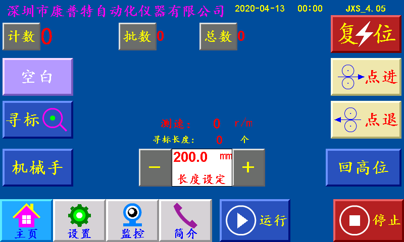 三、主页 长度设定:显示制袋所设定长度,单位:毫米(也可以当按键直接调节长度) 机械手:点击进入机械手参数界面。 计数/清零:单批次累计到一批个数结束时,个数自动归零;按“计数/清零”键清零清个数。 批数/清零:一批结束后,批数加“1”, 总数/清零:个数每加一个,总数加“1”;按“总数/清零”键清零总数。 空白/深色/浅色:三种状态切换。 空白:指光电忽略色标光电传感器信号; 深色:指跟踪印刷制品时,以深颜色的色标点为跟踪点; 浅色:指跟踪印刷制品时,以浅颜色的色标点为跟踪点。 寻标:当‘寻标’键选择“深色/浅色”时按此键,伺服(步进)电机一直转到深色的色标点自动停转时,设置为“追深”;伺服(步进)电机一直转到浅色的色标点自动停转时,设置为“追浅。 当‘寻标’键选择“空白”时,按此键无效 点进:在停止状态下,手动伺服(步进)电机正转。 点退:在停止状态下,手动伺服(步进)电机反转,在运行状态下此键变为“补数”,按此键计数减1。 复位:系统不能正常工作时,按此键程序重新启动,也可以做紧急停机用。 运行:按此键,主机正常运行。(长按3秒左右) 停止:按此键,霍尔开关GK1检测到高位停机信号;主机自动停机。 状态显示:运行/停止/不在高位/暂停/脱标/不在原点,六种状态切换显示。 运行:按启动键后显示“运行”。 停止:通电后一直显示“停止”。 不在高位:变频主机启动时未在高位时,显示“不在高位”。