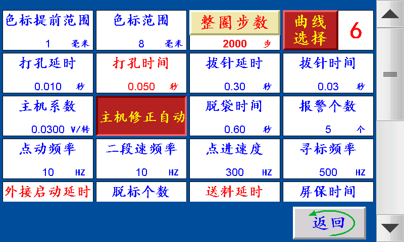 五、副菜单 色标范围:制作彩色制品时,伺服(步进)电机以恒定的速度寻找色标点的范围(即色标光电在『长度—设定的色标范围长度』范围内寻找色标,寻至『长度+设定的色标范围长度』。 色标提前范围:制作彩色制品时,伺服(步进)电机在料送结束之前,提前以恒定的速度寻找色标。 打孔延时:送料结束后延时此参数设定的时间后打孔信号输出。 打孔时间:伺服(步进)电机转结束,打孔电磁阀工作的时间。 拔针延时:一批结束后延时此参数设定的时间后拔针信号输出。 拔针时间:一批结束后延时“拔针延时”的时间后拔针信号输出,跟脱袋信号一起断开。 脱袋时间:一批结束后延时“拔针延时”加“拔针时间”的时间后脱袋信号输出,时间结束后跟拔针信号一起断开 横吹百分比:由输入点X01送料信号控制横吹信号输出,输出时间由此参数来设定调节。 竖吹时间:由输入点竖吹输入控制竖吹信号输出,时间由此参数来设定调节。 报警个数:一批结束前提前N个报警。 点动频率:停止状态下,X04(点动)收到信号时,Y07主机信号输出,切刀上下运行,速度由此参数调节。 二段速频率:主机运行时按停止键,主机切换成二段速停机,二段速速度由此参数调节。 点进速度:伺服(步进)电机的点进/点退时的速度,设定越大,伺服(步进)电机的转速越快。 寻标频率:伺服(步进)电机追色标时的速度,设定越大,伺服(步进)电机的转速越快。 外接启动延时:点击外接启动按钮时,持续该时间后主机开始启动。 脱标个数:设定N个,制作彩色制品时,跟踪N次色标点,跟踪不住自动停机。 送料延时:下一次送料时,延时送料延时时间后开始送料。 屏保时间:主机运行状态下,在主界面停留此时间进入屏保状态。(设置0则屏保无效) 整圈步数:伺服(步进)电机转一圈所需要的脉冲个数。 曲线选择:1~9,步进电机默认1,伺服电机默认6 堵料时间:当堵料信号高于堵料时间时,蜂鸣器报警,故障停机显示“堵料” 主机系数:调节主机正常运行时的速度快慢。 主机修正手动/主机修正自动: 主机修正手动:手动调节主机系数来改变主机速度 主机修正自动:自动修正好主机速度对应的主机系数大小。