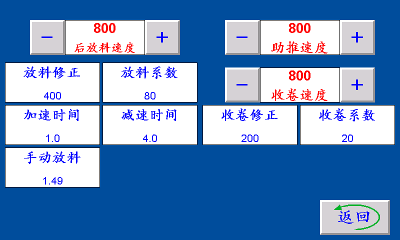 三、主页 长度设定:显示制袋所设定长度,单位:毫米(也可以当按键直接调节长度) 主机速度:控制主机加减速快慢。 放料设置:进入放料设置界面修正当前主机模拟系数。 手动操作:点击进入手动操作界面。 补偿长度:点击加减键设置补偿伺服(步进)电机多走少走。 计数/清零:单批次累计到一批个数结束时,个数自动归零;按“计数/清零”键清零清个数。 批数/清零:一批结束后,批数加“1”。 总数/清零:个数每加一个,总数加“1”;按“总数/清零”键清零总数。 空白/深色/浅色:三种状态切换。 空白:指光电忽略色标光电传感器信号; 深色:指跟踪印刷制品时,以深颜色的色标点为跟踪点; 浅色:指跟踪印刷制品时,以浅颜色的色标点为跟踪点。 点进:在停止状态下,手动伺服(步进)电机正转。 点退:在停止状态下,手动伺服(步进)电机反转,在运行状态下此键变为“补数”,按此键计数减1。 复位:系统不能正常工作时,按此键程序重新启动,也可以做紧急停机用。 运行:按此键,主机正常运行。(长按3秒左右) 停止:按此键,霍尔开关GK1检测到高位停机信号;主机自动停机。 状态显示:运行/停止/超速/暂停/脱标,多种状态切换显示。 运行:按启动键后显示“运行”。 停止:通电后一直显示“停止”。 超速:主机速度过快步进(伺服)电机送料还没有结束时,主机停机显示“超速”。 暂停:当机型选择“暂停”时一批结束停机N秒后主机自动开机。 脱标:在制作印刷制品时没有跟踪到色标点显示“脱标”。