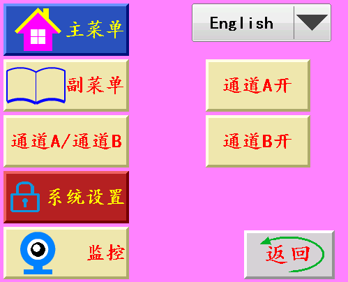 二、设置 English/中文:中文和英文界面切换按键。 系统设置:按此键输入正确的密码,方可进入。 主菜单:按此键进入主菜单设置界面。 副菜单:按此键进入副菜单设置界面。 通道A/通道B:按此键进入通道A、B设置界面。 监控界面:按此键进入监控界面 通道A开:按下此键,通道功能A关闭 通道B开:按下此键,通道功能B关闭