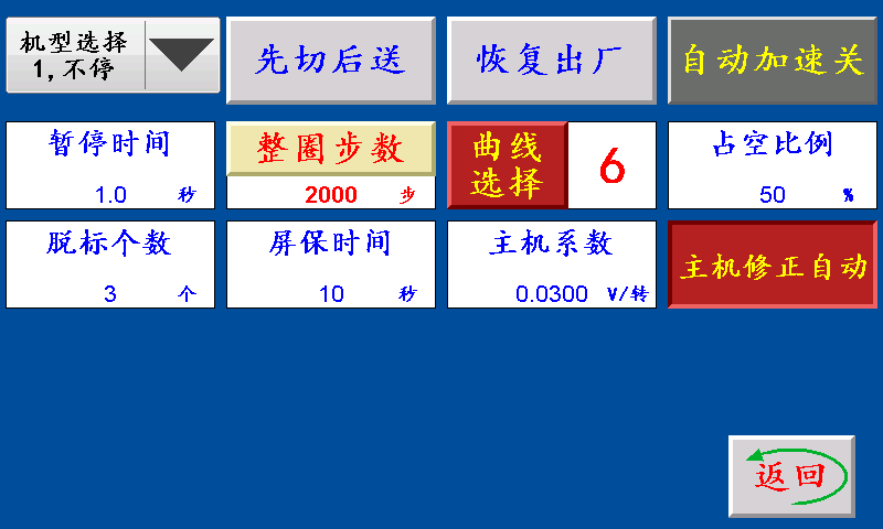 四、主菜单 不停/暂停/停机:“不?!保阂慌崾骰煌?,继续正常工作。 “暂?!保阂慌崾骰萃#5皆萃J奔浣崾?,主机自动开机。 “?;保阂慌崾骰远;蟛辉僭诵?,手动按启动键方可运行。 “空切”:一批结束主机继续空切,脱袋滞后时间结束后继续送料。 曲线选择:1~9,步进电机默认1,伺服电机默认6 先切后送/先送后切:“先切后送”:按启动键,主机先运行,GK1霍尔开关检测到伺服(步进)电机的送料信号,伺服(步进)电机开始送料。 “先送后切”:按启动键,伺服(步进)先送料,送料结束后主机再运行。 恢复出厂:按此键恢复出厂设置(慎用)。 暂停时间:当机型选择暂停,一批结束后主机自动?;瓒ǖ氖奔?。 占空比例:“自动送料”时,主机运行一个周期送料所占的时间比例。 脱标个数:设定N个,制作彩色制品时,跟踪N次色标点,跟踪不住自动停机。 自动加速关/自动加速开:自动加速关:自己调节送料速度 自动加速开:根据设定的袋长等自动调节送料速度 整圈步数:伺服(步进)电机转一圈所需要的脉冲个数。 屏保时间:主机运行状态下,在主界面停留此时间进入屏保状态。(设置0则屏保无效) 主机修正手动/主机修正自动: 主机修正手动:手动调节主机系数来改变主机速度 主机修正自动:自动修正好主机速度对应的主机系数大小。