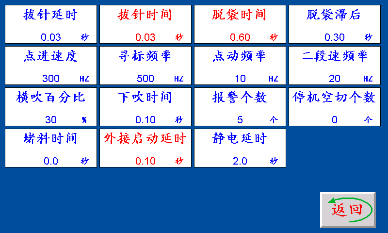 五、副菜单 拔针延时:一批结束后延时此参数设定的时间后拔针信号输出。 拔针时间:一批结束后延时“拔针延时”的时间后拔针信号输出,跟脱袋信号一起断开。 脱袋时间:一批结束后延时“拔针延时”加“拔针时间”的时间后脱袋信号输出,时间结束后跟拔针信号一起断开 脱袋滞后:一批结束后脱袋信号关闭后持续的时间。 点进速度:伺服(步进)电机的点进/点退时的速度,设定越大,伺服(步进)电机的转速越快。 寻标频率:伺服(步进)电机追色标时的速度,设定越大,伺服(步进)电机的转速越快。 点动频率:停止状态下,X04(点动)收到信号时,Y07主机信号输出,切刀上下运行,速度由此参数调节。 二段速频率:主机运行时按停止键,主机切换成二段速停机,二段速速度由此参数调节。 横吹百分比:由输入点X01送料信号控制横吹信号输出,输出时间由此参数来设定调节。 下吹时间:由输入点下吹输入控制下吹信号输出,时间由此参数来设定调节。 外接启动延时:点击外接启动按钮时,持续该时间后主机开始启动。 报警个数:一批结束前提前N个报警。 ?;涨懈鍪好看瓮;?,主机需要空切的次数。 堵料时间:连续收到堵料信号“堵料时间”后,主机高位停止,显示故障“堵料”