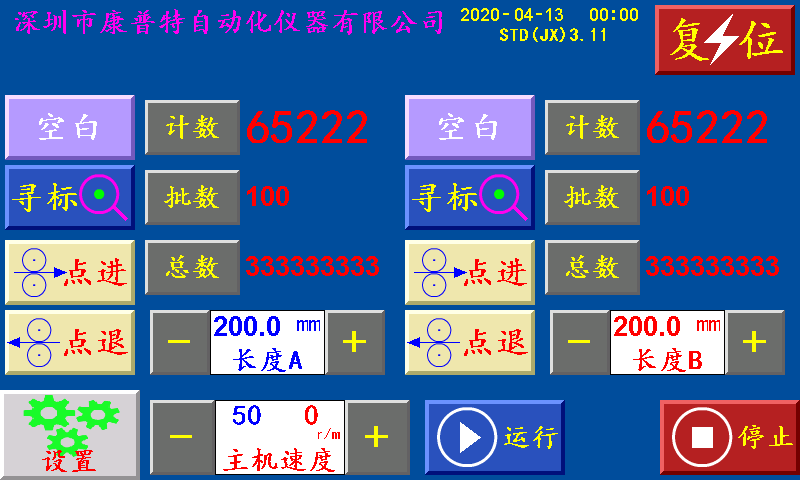 三、主页 长度设定:显示制袋所设定长度,单位:毫米(也可以当按键直接调节长度) 主机速度:控制主机加减速快慢。 计数开/关:控制每次送料是否需要计数。 计数/清零:单批次累计到一批个数结束时,个数自动归零;按“计数/清零”键清零清个数。 总数/清零:个数每加一个,总数加“1”;按“总数/清零”键清零总数。 空白/深色/浅色:三种状态切换。 空白:指光电忽略色标光电传感器信号; 深色:指跟踪印刷制品时,以深颜色的色标点为跟踪点; 浅色:指跟踪印刷制品时,以浅颜色的色标点为跟踪点。 寻标:当‘寻标’键选择“深色/浅色”时按此键,伺服(步进)电机一直转到深色的色标点自动停转时,设置为“追深”;伺服(步进)电机一直转到浅色的色标点自动停转时,设置为“追浅。 当‘寻标’键选择“空白”时,按此键无效 点进:在停止状态下,手动伺服(步进)电机正转。 点退:在停止状态下,手动伺服(步进)电机反转,在运行状态下此键变为“补数”,按此键计数减1。 复位:系统不能正常工作时,按此键程序重新启动,也可以做紧急停机用。 运行:按此键,主机正常运行。(长按3秒左右) 停止:按此键,霍尔开关GK1检测到高位停机信号;主机自动停机。 状态显示:运行/停止/超速/暂停/脱标/断料,六种状态切换显示。 运行:按启动键后显示“运行”。 停止:通电后一直显示“停止”。 超速:主机速度过快步进(伺服)电机送料还没有结束时,主机停机显示“超速”。 暂停:当机型选择“暂停”时一批结束停机N秒后主机自动开机。 脱标A/B:在制作印刷制品时没有跟踪到色标点显示“脱标”。 断料:当主机运行,X15检测到断料信号时,蜂鸣器报警,主机停机,显示故障“断料”。主机停止状态下X15检测到断料信号时,蜂鸣器报警,显示故障“断料”。(按“停止”清除故障)