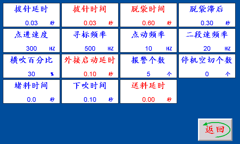 五、副菜单 拔针延时:一批结束后延时此参数设定的时间后拔针信号输出。 拔针时间:一批结束后延时“拔针延时”的时间后拔针信号输出,跟脱袋信号一起断开。 脱袋时间:一批结束后延时“拔针延时”加“拔针时间”的时间后脱袋信号输出,时间结束后跟拔针信号一起断开 脱袋滞后:一批结束后脱袋信号关闭后持续的时间。 点进速度:伺服(步进)电机的点进/点退时的速度,设定越大,伺服(步进)电机的转速越快。 寻标频率:伺服(步进)电机追色标时的速度,设定越大,伺服(步进)电机的转速越快。 点动频率:停止状态下,X04(点动)收到信号时,Y07主机信号输出,切刀上下运行,速度由此参数调节。 二段速频率:主机运行时按停止键,主机切换成二段速停机,二段速速度由此参数调节。 横吹百分比:由输入点X01送料信号控制横吹信号输出,输出时间由此参数来设定调节。 外接启动延时:点击外接启动按钮时,持续该时间后主机开始启动。 报警个数:一批结束前提前N个报警。 停机空切个数:每次停机时,主机需要空切的次数。 堵料时间:连续收到堵料信号“堵料时间”后,主机高位停止,显示故障“堵料” 静电延时:高位停机时,“静电延时”的时间过后关闭。 送料延时:下一次送料时,延时送料延时时间后开始送料。