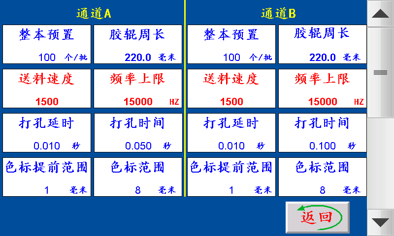 六、通道A/通道B 整本预置:一批设定的个数,提前5个报警。单位:个 胶辊周长:伺服(步进)电机带动橡胶辊转一圈的长度。 送料速度:伺服(步进)电机的加减速时间,设定越大,伺服(步进)电机起步越快。 频率上限:伺服(步进)电机的最高转速,设定越大,伺服(步进)电机的转速越快。 打孔延时:一批结束后延时此参数设定的时间后打孔信号输出。 打孔时间:伺服(步进)电机转结束,打孔电磁阀工作的时间。 色标范围:制作彩色制品时,伺服(步进)电机以恒定的速度寻找色标点的范围(即色标光电在『长度—设定的色标范围长度』范围内寻找色标,寻至『长度+设定的色标范围长度』。 色标提前范围:制作彩色制品时,伺服(步进)电机在料送结束之前,提前以恒定的速度寻找色标。 停机回缩长度:每次停机后,送料往回缩的长度 停机空切个数:每次停机时,主机需要空切的次数。
