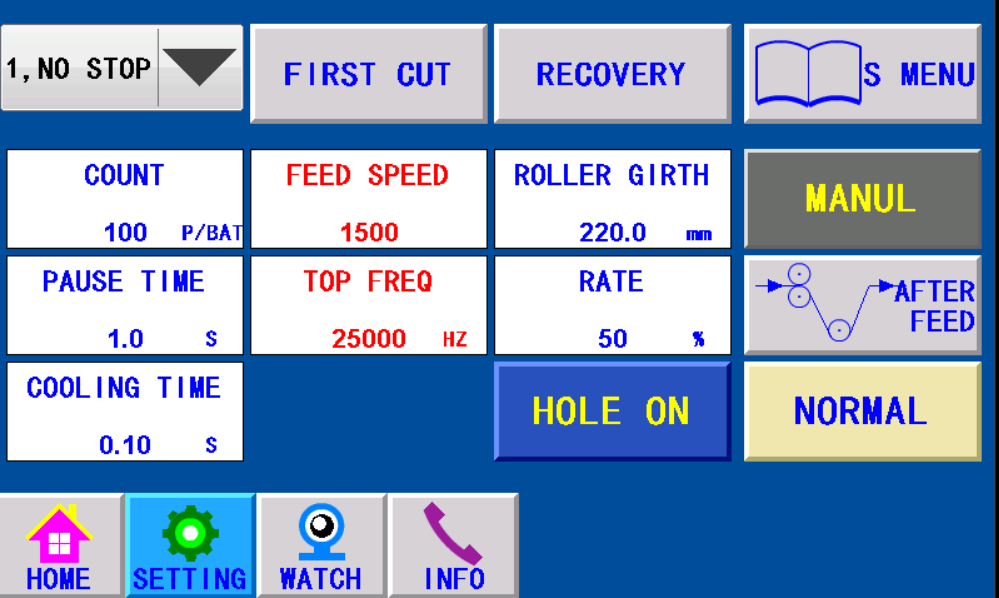 不停/暂停/停机:“不停”:一批结束主机不停,继续正常工作。 NOT STOPNOT STOP / PAUSE/ STOP/: "Keep in the way: a batch of end hosts keep working. "Pause: a batch of end host pause, stop to pause time end, the host automatically boot. "Stop the company: a batch of end main engine stops running, manually press the start key to run. 先切后送/先送后切:“先切后送”:按启动键,主机先运行,GK1霍尔开关检测到伺服(步进)电机的送料信号,伺服(步进)电机开始送料。 FIRST CUTFIRST CUT / FIRST FEED: "First cut: press the start key, and the host first runs the gk1 hall switch to detect the feed signal of the servo (step) motor, and the servo (step) motor begins to feed. "First send the back: press the start key, the servo (step in) first the feed, the rear master machine will run again.RECOVER: Press this button to recover the default settings. SETTING: click this key to enter the setting interface to correct the current host simulation coefficient. RETURN FACTORY: press this key to restore factory Settings (caution). SUBMENU: click this key to enter the submenu interface. THE WHOLE PRESET: a number of sets, five alerts in advance. Unit: TIME OF PAUSE: when the machine chooses to suspend, the time set by the end of the rear main machine is set. FEED SPEED: the extra speed time of the servo (step) motor, the larger the set, the faster the servo (step) motor starts. FREQUENCY LIMIT: the maximum speed of the servo (step) motor, the larger the set, the faster the servo (step) motor. THE CIRCUMFERENCE OF THE RUBBER ROLLER: the servo (step) motor drives the length of the rubber roll. PROPORTION:When "automatic feed", the host runs a period of time per cycle. COOLING TIME: the long bag mode opens, and the host cuts the bag back to the high back to cool the time PUNCH/OFF: control whether the punch signal is required. Automatic acceleration: adjust the feed speed Automatic acceleration: according to the set of the bag, automatic adjustment of the feed speed LONG BAG MODE CLOSE/LONG BAG MODE: Long bag mode: host Long bag mode: the host is cut off the high level cooling suspension