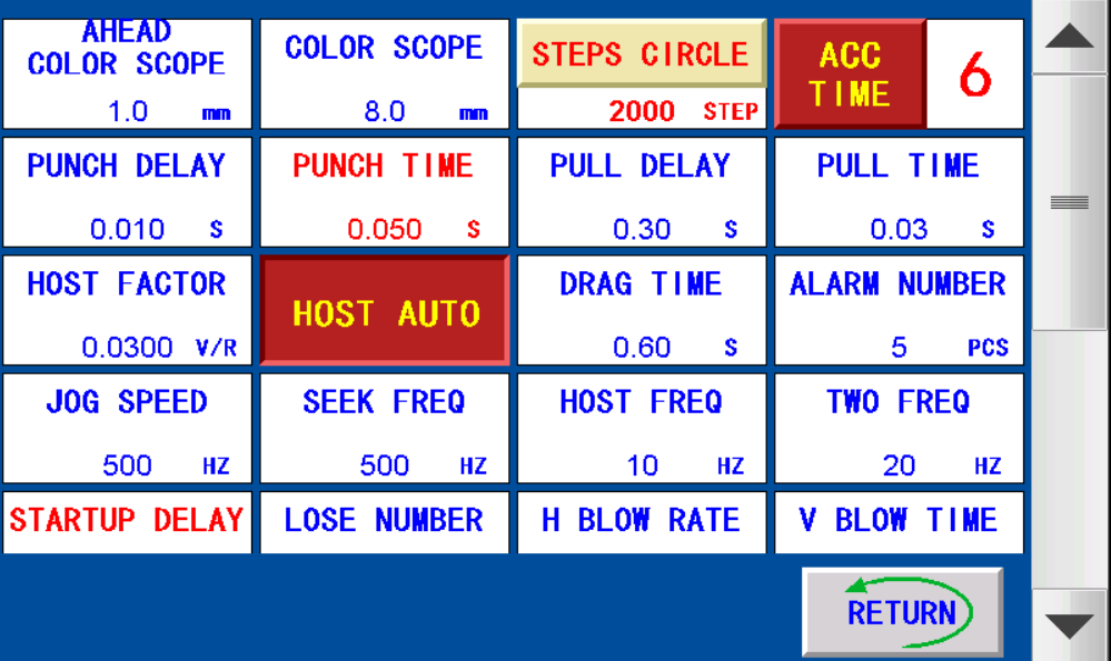 COLOR LABEL SCOPECOLOR SCOPE: when making color products, the servo (step) motor is looking for the range of color punctuation at constant speed (i.e., the color beacon photoelectric in the "length of the color range length" of the "length of the color range", and the length of the color scale is found. COLOR SCALE ADVANCE RANGE: when making color products, the servo (step) motor is expected to look for color before the delivery is finished. PUNCH DELAY: the output of the hole signal after the time of the delay. PUNCH TIME: servo (step) motor is turned over, and the time of the punching electromagnetic valve. NEEDLE DELAY: the output of the needle signal after the end of the delay. NEEDLE TIME: the output of the needle signal after the end of the batch is finished, and the signal is disconnected from the removal of the bag signal. HORIZONTAL BLOW PERCENTAGE: the output time is set by the input point x01 signal control. VERTICAL BLOW TIME: the input controls the vertical blow signal output, and the time is set to adjust. TAKE OFF THE BAG TIME: after the end of the batch "pull the needle delay" and "pull the needle time", the signal output will be removed after the end of the batch. ALARM NUMBER: n alarm before the end of a batch. SPEED: the speed of the motor point of the motor, the larger the setting, the faster the servo (step) motor. Target frequency:the speed of the servo (step) motor, the larger the set, the faster the servo (step) motor. POINT MOVEMENT FREQUENCY: when the signal is received by the stop state, the signal output of the main engine is received, the cutting knife is run up and down, and the velocity is adjusted accordingly. THE SPEED FREQUENCY OF THE TWO SEGMENTS: the host is switched to the stop key, the host is switched to two segments of the stop, and the speed of the two segments is adjusted accordingly. EXTERNAL STARTUP LATENCY: when you click on the external button, the main machine starts starting. DESTANDARD NUMBER: set n, make color products, follow n time punctuation, don't follow the automatic stop. FEED DELAY: the next time the feed is available, the delay time delay time begins to feed. SCREEN WARRANTY TIME: the main interface stops at the main interface and enters the screen. (set 0 to hold the screen) PRESSING TIME: meet pressing signal, the time of the main engine signal is closed. TOTAL STOP NUMBER: total stop number of downtime, total number of stops when the number is set. THE LENGTH OF THE STOP RETRACT: the length of the feed back after each outage THE NUMBER OF STOPS IS CUT: the host needs to cut the number of times each time the stop is stopped. AUXILIARY PERCENTAGE: the auxiliary signal is synchronous with the feeding material, and the supplementary signal is finished in advance of the percentage of the feed length. PRECHECK-OUT LENGTH: return the length of the feed back. ENTIRE CIRCLE PACE:the number of pulses required for the servo (step) motor to rotate a circle. THE CURVE IS SELECTED: 1~ 9. step in the motor default 1, servo motor default 6 HOST COEFFICIENT: control host speed is slow. THE MAIN ENGINE IS MODIFIED MANUALLY/THE MAIN ENGINE IS FIXED AUTOMATICALLY: The main engine is modified manually: manually regulating the host coefficient to change the host speed The main engine is fixed automatically: automatically fixed the main engine coefficient size of the host speed. 打孔延时:伺服(步进)电机转结束后到打孔电磁阀工作前之间的延时。 打孔时间:伺服(步进)电机转结束,打孔电磁阀工作的时间。. 脱标个数:设定N个,制作彩色制品时,跟踪N次色标点,跟踪不住自动停机。