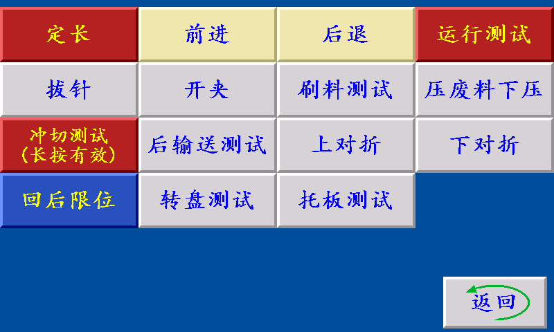 定长:点击此键,机械手先向前限位移动,到前限位后往后限位移动,并计算出前后限位的脉冲数。最后经过冲切保护位后回到待机位。 前进:在手动状态下,手动伺服(步进)机械手前移。 后退:在手动状态下,手动伺服(步进)机械手后移。 运行测试:长按此键,机械进行一次整体的工作。 回后限位:点击此键,机械手往后限位移动。 冲切测试:长按此键,进入冲切测试界面。 注释:手动测试信号输出时,机械手需在后限位。