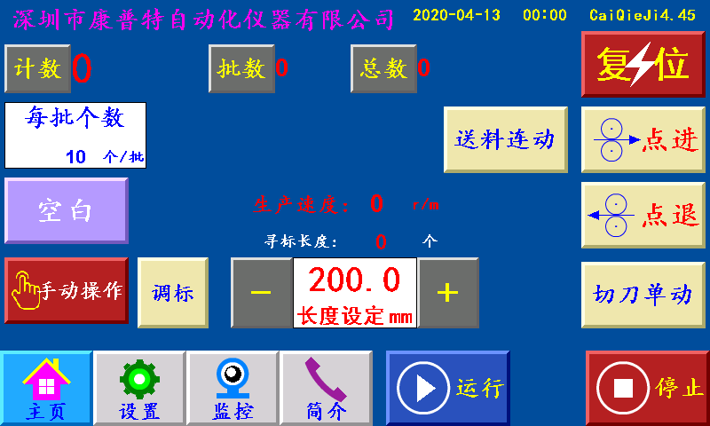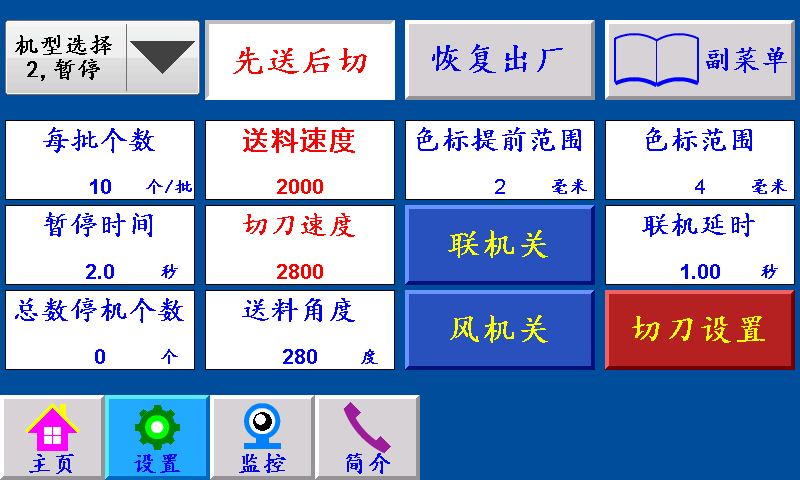 三、主页 长度设定:显示制袋所设定长度,单位:毫米(也可以当按键直接调节长度) 计数/清零:单批次累计到一批个数结束时,个数自动归零;按“计数/清零”键清零清个数。 批数/清零:一批结束后,批数加“1”, 总数/清零:个数每加一个,总数加“1”;按“总数/清零”键清零总数。 空白/深色/浅色:三种状态切换。 空白:指光电忽略色标光电传感器信号; 深色:指跟踪印刷制品时,以深颜色的色标点为跟踪点; 浅色:指跟踪印刷制品时,以浅颜色的色标点为跟踪点。 每批个数:一批设定的个数,提前5个报警。单位:个 手动操作:点击进入手动操作界面。 点进:在停止状态下,手动伺服(步进)电机正转。 点退:在停止状态下,手动伺服(步进)电机反转,在运行状态下此键变为“补数”,按此键计数减1。 送料连动:在停止状态下,手动伺服(步进)电机一直正转。 切刀单动:在停止状态下,切刀伺服(步进)电机正转一圈。 调标:在停止状态下,输出色标校准信号。 复位:系统不能正常工作时,按此键程序重新启动,也可以做紧急?;?。 运行:按此键,主机正常运行。(长按3秒左右) 停止:按此键,霍尔开关GK1检测到高位?;藕?;主机自动?;?。 状态显示:运行/停止/切刀降速/暂停/脱标/完料,六种状态切换显示。 运行:按启动键后显示“运行”。 停止:通电后一直显示“停止”。 暂停:当机型选择“暂停”时一批结束?;鶱秒后主机自动开机。 脱标:在制作印刷制品时没有跟踪到色标点显示“脱标”。 四、设置 ![]() 不停/暂停/停机:“不停”:一批结束主机不停,继续正常工作。 “暂?!保阂慌崾骰萃?,停到暂停时间结束,主机自动开机。 “?;保阂慌崾骰远;蟛辉僭诵校侄雌舳娇稍诵?。 先切后送/先送后切:“先切后送”:按启动键,主机先运行,GK1霍尔开关检测到伺服(步进)电机的送料信号,伺服(步进)电机开始送料。 “先送后切”:按启动键,伺服(步进)先送料,送料结束后主机再运行。 切刀设置:点击此键进入切刀设置界面。 恢复出厂:按此键恢复出厂设置(慎用)。 副菜单:点击此键进入副菜单界面。 每批个数:一批设定的个数,提前5个报警。单位:个 暂停时间:当机型选择暂停,一批结束后主机自动?;瓒ǖ氖奔?。 送料速度:送料伺服(步进)电机的加减速时间,设定越大,伺服(步进)电机起步越快。 切刀速度:切刀伺服(步进)电机的加减速时间,设定越大,伺服(步进)电机起步越快。 色标范围:制作彩色制品时,伺服(步进)电机以恒定的速度寻找色标点的范围(即色标光电在『长度—设定的色标范围长度』范围内寻找色标,寻至『长度+设定的色标范围长度』。 色标提前范围:制作彩色制品时,伺服(步进)电机在料送结束之前,提前以恒定的速度寻找色标。 联机延时:检测到放料开关信号时,主机暂时停止,等待放料开关信号没有时,再延时该时间后主机继续运行。 总数停机个数:总数?;柚酶鍪?,总数到达设定个数时停机。 送料角度:切刀从高位转到送料角度时,送料伺服(步进)电机开始转动。 联机开/关:控制是否打开联机检测动作。 风机开/关:控制风机信号是否输出。