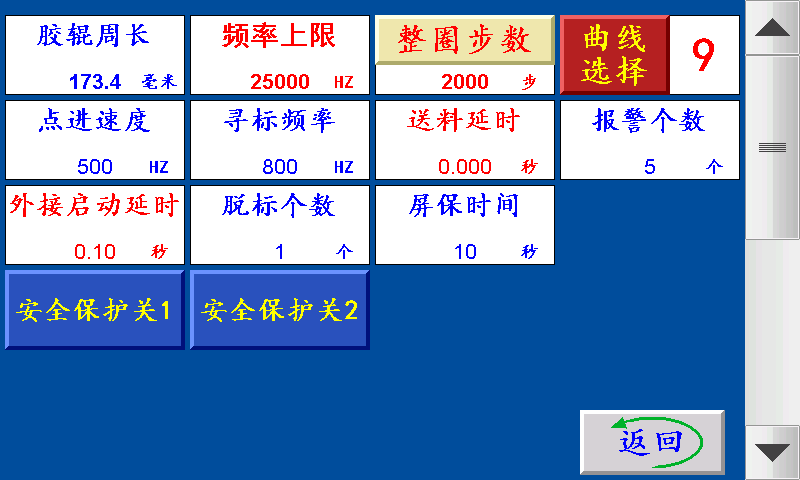五、副菜单 色标范围:制作彩色制品时,伺服(步进)电机以恒定的速度寻找色标点的范围(即色标光电在『长度—设定的色标范围长度』范围内寻找色标,寻至『长度+设定的色标范围长度』。 色标提前范围:制作彩色制品时,伺服(步进)电机在料送结束之前,提前以恒定的速度寻找色标。 频率上限:伺服(步进)电机的最高转速,设定越大,伺服(步进)电机的转速越快。 胶辊周长:伺服(步进)电机带动橡胶辊转一圈的长度。 报警个数:一批结束前提前N个报警。 点进速度:伺服(步进)电机的点进/点退时的速度,设定越大,伺服(步进)电机的转速越快。 寻标频率:伺服(步进)电机追色标时的速度,设定越大,伺服(步进)电机的转速越快。 外接启动延时:点击外接启动按钮时,持续该时间后主机开始启动。 脱标个数:设定N个,制作彩色制品时,跟踪N次色标点,跟踪不住自动停机。 屏保时间:主机运行状态下,在主界面停留此时间进入屏保状态。(设置0则屏保无效) 整圈步数:伺服(步进)电机转一圈所需要的脉冲个数。 曲线选择:1~9,步进电机默认1,伺服电机默认6 安全?;た?/span>/关:检测到安全?;ば藕攀保低诚允竟收喜⑼;?。 六、手动操作