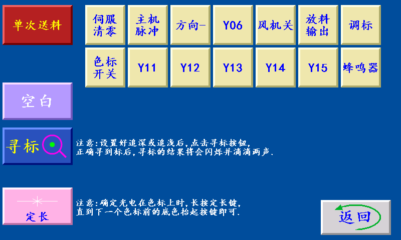 单次送料:停机状态下,点击此键,送一次料后停止。 寻标:当‘寻标’键选择“深色/浅色”时按此键,伺服(步进)电机一直转到深色的色标点自动停转时,设置为“追深”;伺服(步进)电机一直转到浅色的色标点自动停转时,设置为“追浅。 当‘寻标’键选择“空白”时,按此键无效 (注释:黄色按键在停机状态下,测试脚位是否正常)