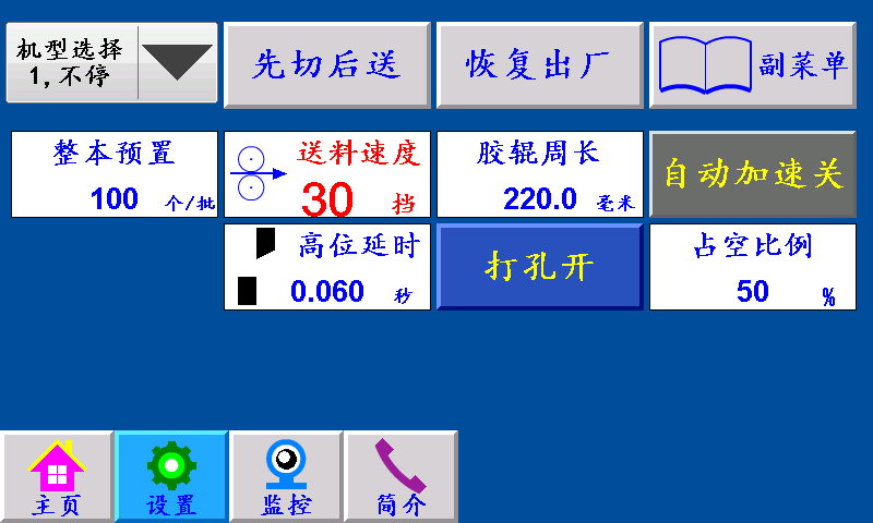 色标范围:制作彩色制品时,伺服(步进)电机以恒定的速度寻找色标点的范围(即色标光电在『长度—设定的色标范围长度』范围内寻找色标,寻至『长度+设定的色标范围长度』。 色标提前范围:制作彩色制品时,伺服(步进)电机在料送结束之前,提前以恒定的速度寻找色标。 打孔延时:送料结束后延时此参数设定的时间后打孔信号输出。 打孔时间:伺服(步进)电机转结束,打孔电磁阀工作的时间。 打孔2延时:送料结束后延时此参数设定的时间后打孔2信号输出。 打孔2时间:伺服(步进)电机转结束,打孔2电磁阀工作的时间。 拔针延时:一批结束后延时此参数设定的时间后拔针信号输出。 拔针时间:一批结束后延时“拔针延时”的时间后拔针信号输出,跟脱袋信号一起断开。 脱袋时间:一批结束后延时“拔针延时”加“拔针时间”的时间后脱袋信号输出,时间结束后跟拔针信号一起断开 横吹百分比:由输入点X01送料信号控制横吹信号输出,输出时间由此参数来设定调节。 竖吹时间:由输入点竖吹输入控制竖吹信号输出,时间由此参数来设定调节。 报警个数:一批结束前提前N个报警。 点动频率:停止状态下,X04(点动)收到信号时,Y07主机信号输出,切刀上下运行,速度由此参数调节。 二段速频率:主机运行时按停止键,主机切换成二段速停机,二段速速度由此参数调节。 点进速度:伺服(步进)电机的点进/点退时的速度,设定越大,伺服(步进)电机的转速越快。 寻标频率:伺服(步进)电机追色标时的速度,设定越大,伺服(步进)电机的转速越快。 外接启动延时:点击外接启动按钮时,持续该时间后主机开始启动。 脱标个数:设定N个,制作彩色制品时,跟踪N次色标点,跟踪不住自动停机。 送料延时:下一次送料时,延时送料延时时间后开始送料。 屏保时间:主机运行状态下,在主界面停留此时间进入屏保状态。(设置0则屏保无效) 合刀延时:放料关闭时,延时该时间后合刀关闭时间。 频率上限:伺服(步进)电机的最高转速,设定越大,伺服(步进)电机的转速越快。 步进慢速/步进快速/伺服慢速/伺服快速:设置电机的脉冲曲线,步进曲线对应的整圈步数默认为600步,伺服曲线对应的整圈步数默认为2000步。 主机系数:控制主机速度快慢。 主机修正手动/主机修正自动: 主机修正手动:手动调节主机系数来改变主机速度 主机修正自动:自动修正好主机速度对应的主机系数大小。 六、放料设置界面