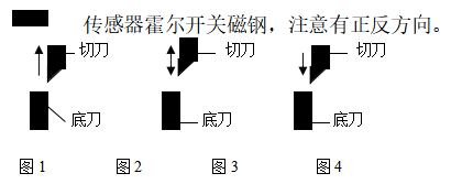 A ,开始送料位置,此时切刀向上运动,刚离开底刀,步进电机可顺利地将被制料送出(图1)。 B, 高位停机位置,此时切刀向上运动,至最高点,停机,可使烫切刀不致于破坏被制料(图2)。 C ,拖料极限位置,此时切刀向下运动,刚到底刀处,此时步进电机不能再送料,否则,被制料会堵于刀内或拉断(图3)。 A’取样逻辑位置,位于A与D之间。 ![]()