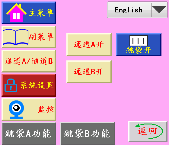 本系统输入27个点(包括2路高速差分测速端口),输出27个点,外加8路模拟量输出。可同时控制主电机(三相异步电机)、两个送料电机(伺服电机或步进电机),真正意义上的三个电机同步运行。即全自动加速功能和主机速度数据同时换算后速度自动分配。拥有两个通道同时独立控制送料电机送料,两个通道皆有格子袋功能。 English/中文:中文和英文界面切换按键。 系统设置:按此键输入正确的密码,方可进入。 跳袋功能:进入跳袋参数界面,修改格子袋中格子间的参数。 主菜单:按此键进入主菜单设置界面。 副菜单:按此键进入副菜单设置界面。 通道A/通道B:按此键进入通道A、B设置界面。 跳袋开/关:控制是否需要开启跳袋功能。 通道开/关:打开或者关闭该通道功能。