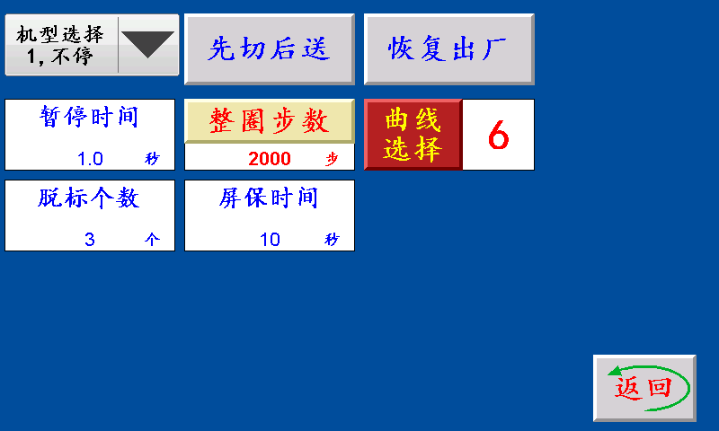 四、主菜单 不停/暂停/停机:“不停”:一批结束主机不停,继续正常工作。 “暂停”:一批结束主机暂停,停到暂停时间结束,主机自动开机。 “停机”:一批结束主机自动停机后不再运行,手动按启动键方可运行。 先切后送/先送后切:“先切后送”:按启动键,主机先运行,GK1霍尔开关检测到伺服(步进)电机的送料信号,伺服(步进)电机开始送料。 “先送后切”:按启动键,伺服(步进)先送料,送料结束后主机再运行。 恢复出厂:按此键恢复出厂设置(慎用)。 整本预置:一批设定的个数,提前5个报警。单位:个 暂停时间:当机型选择暂停,一批结束后主机自动停机所设定的时间。 脱标个数:设定N个,制作彩色制品时,跟踪N次色标点,跟踪不住自动停机。 屏保时间:主机运行状态下,在主界面停留此时间进入屏保状态。(设置0则屏保无效) 整圈步数:伺服(步进)电机转一圈所需要的脉冲个数。 曲线选择:1~9,步进电机默认1,伺服电机默认6
