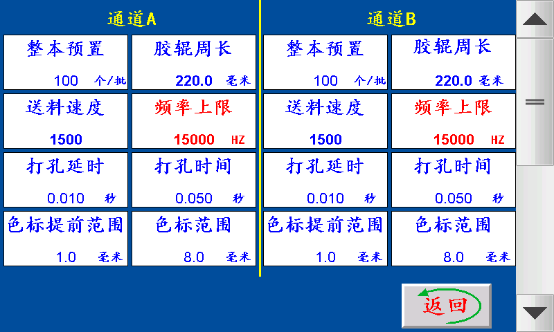 六、通道A/通道B 整本预置:一批设定的个数,提前5个报警。单位:个 胶辊周长:伺服(步进)电机带动橡胶辊转一圈的长度。 送料速度:伺服(步进)电机的加减速时间,设定越大,伺服(步进)电机起步越快。 频率上限:伺服(步进)电机的最高转速,设定越大,伺服(步进)电机的转速越快。 打孔延时:一批结束后延时此参数设定的时间后打孔信号输出。 打孔时间:伺服(步进)电机转结束,打孔电磁阀工作的时间。 色标范围:制作彩色制品时,伺服(步进)电机以恒定的速度寻找色标点的范围(即色标光电在『长度—设定的色标范围长度』范围内寻找色标,寻至『长度+设定的色标范围长度』。 色标提前范围:制作彩色制品时,伺服(步进)电机在料送结束之前,提前以恒定的速度寻找色标。