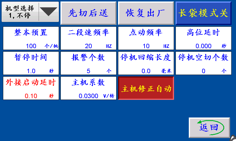 四、主机设置 不停/暂停/?;骸安煌!保阂慌崾骰煌?,继续正常工作。 “暂停”:一批结束主机暂停,停到暂停时间结束,主机自动开机。 “?;保阂慌崾骰远;蟛辉僭诵?,手动按启动键方可运行。 先切后送/先送后切:“先切后送”:按启动键,主机先运行,GK1霍尔开关检测到伺服(步进)电机的送料信号,伺服(步进)电机开始送料。 “先送后切”:按启动键,伺服(步进)先送料,送料结束后主机再运行。 长袋模式关/长袋模式开: 长袋模式关:运行过程中,主机不停 长袋模式开:运行过程中,主机切完后暂停 整本预置:一批设定的个数,提前5个报警。单位:个 二段速频率:主机运行时按停止键,主机切换成二段速停机,二段速速度由此参数调节。 点动频率:停止状态下,X04(点动)收到信号时,Y07主机信号输出,切刀上下运行,速度由此参数调节。 高位延时:在?;氖焙?,主机上升的最高位的位置。该设定值越大,停的位置越高。 暂停时间:当机型选择暂停,一批结束后主机自动?;瓒ǖ氖奔洹?/span> 报警个数:一批结束前提前N个报警。 ?;厮醭ざ龋好看瓮;?,送料往回缩的长度 ?;涨懈鍪好看瓮;?,主机需要空切的次数。 外接启动延时:点击外接启动按钮时,持续该时间后主机开始启动。 主机系数:控制主机速度快慢。 主机修正手动/主机修正自动: 主机修正手动:手动调节主机系数来改变主机速度 主机修正自动:自动修正好主机速度对应的主机系数大小。