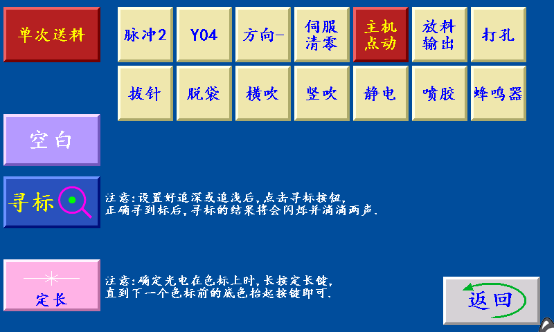 八、手动操作 单次送料:?;刺?,点击此键,送一次料后停止。 寻标:当‘寻标’键选择“深色/浅色”时按此键,伺服(步进)电机一直转到深色的色标点自动 停转时,设置为“追深”;伺服(步进)电机一直转到浅色的色标点自动停转时,设置为“追浅。 当‘寻标’键选择“空白”时,按此键无效