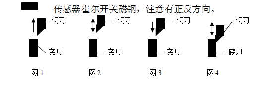 A ,开始送料位置,此时切刀向上运动,刚离开底刀,步进电机可顺利地将被制料送出(图1)。 B, 高位停机位置,此时切刀向上运动,至最高点,?;墒固糖械恫恢掠谄苹当恢屏希ㄍ?span style="font-family:"">2)。 C ,拖料极限位置,此时切刀向下运动,刚到底刀处,此时步进电机不能再送料,否则,被制料会堵于刀内或拉断(图3)。 D, 整本脱袋位置,此时切刀向下运动,刚到最低点,整本机在此位置将拉针拔出,再把整本制品推出(图4)。