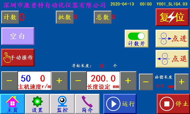 三、主页 长度设定:显示制袋所设定长度,单位:毫米(也可以当按键直接调节长度) 补偿长度:每隔一次送料,制袋所设定长度加补偿长度作为补偿,单位:毫米 主机速度:控制主机加减速快慢。 计数/清零:单批次累计到一批个数结束时,个数自动归零;按“计数/清零”键清零清个数。 批数/清零:一批结束后,批数加“1”, 总数/清零:个数每加一个,总数加“1”;按“总数/清零”键清零总数。 空白/深色/浅色:三种状态切换。 空白:指光电忽略色标光电传感器信号; 深色:指跟踪印刷制品时,以深颜色的色标点为跟踪点; 浅色:指跟踪印刷制品时,以浅颜色的色标点为跟踪点。 点进:在停止状态下,手动伺服(步进)电机正转。 点退:在停止状态下,手动伺服(步进)电机反转,在运行状态下此键变为“补数”,按此键计数减1。 复位:系统不能正常工作时,按此键程序重新启动,也可以做紧急停机用。 运行:按此键,主机正常运行。(长按3秒左右) 停止:按此键,霍尔开关检测到X01停机信号;主机自动停机。 状态显示:运行/停止/超速/暂停/脱标/完料,六种状态切换显示。 运行:按启动键后显示“运行”。 停止:通电后一直显示“停止”。 超速:主机速度过快步进(伺服)电机送料还没有结束时,主机停机显示“超速”。 暂停:当机型选择“暂停”时一批结束停机N秒后主机自动开机。 脱标:在制作印刷制品时没有跟踪到色标点显示“脱标”。 完料:当主机运行,X15检测到断料信号时,蜂鸣器报警,主机停机,显示故障“完料”。主机停止状态下X15检测到断料信号时,蜂鸣器报警,显示故障“完料”。(按“停止”清除故障)